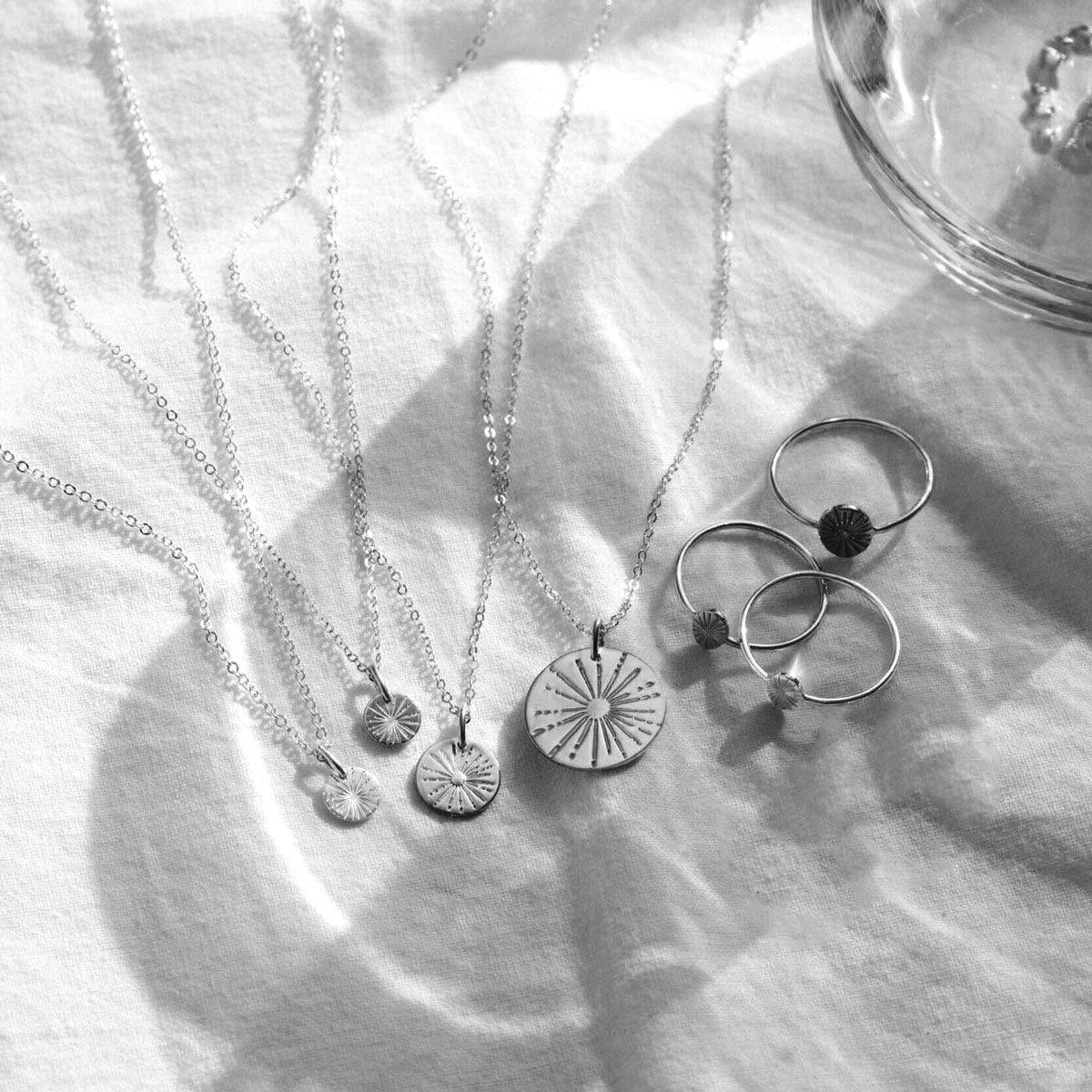 - کالکشن خورشید ، مجموعهای از گردنبند نقره و انگشتر نقره حکاکی شده با نمادهایی الهامگرفته از نور خورشید است که با طراحی مینیمال و نمادین خود، حس طراوت را همیشه همراه شما نگه میدارد. هر روزی که خورشید طلوع میکند، یادآور امید، انرژی و آغاز تازه است.