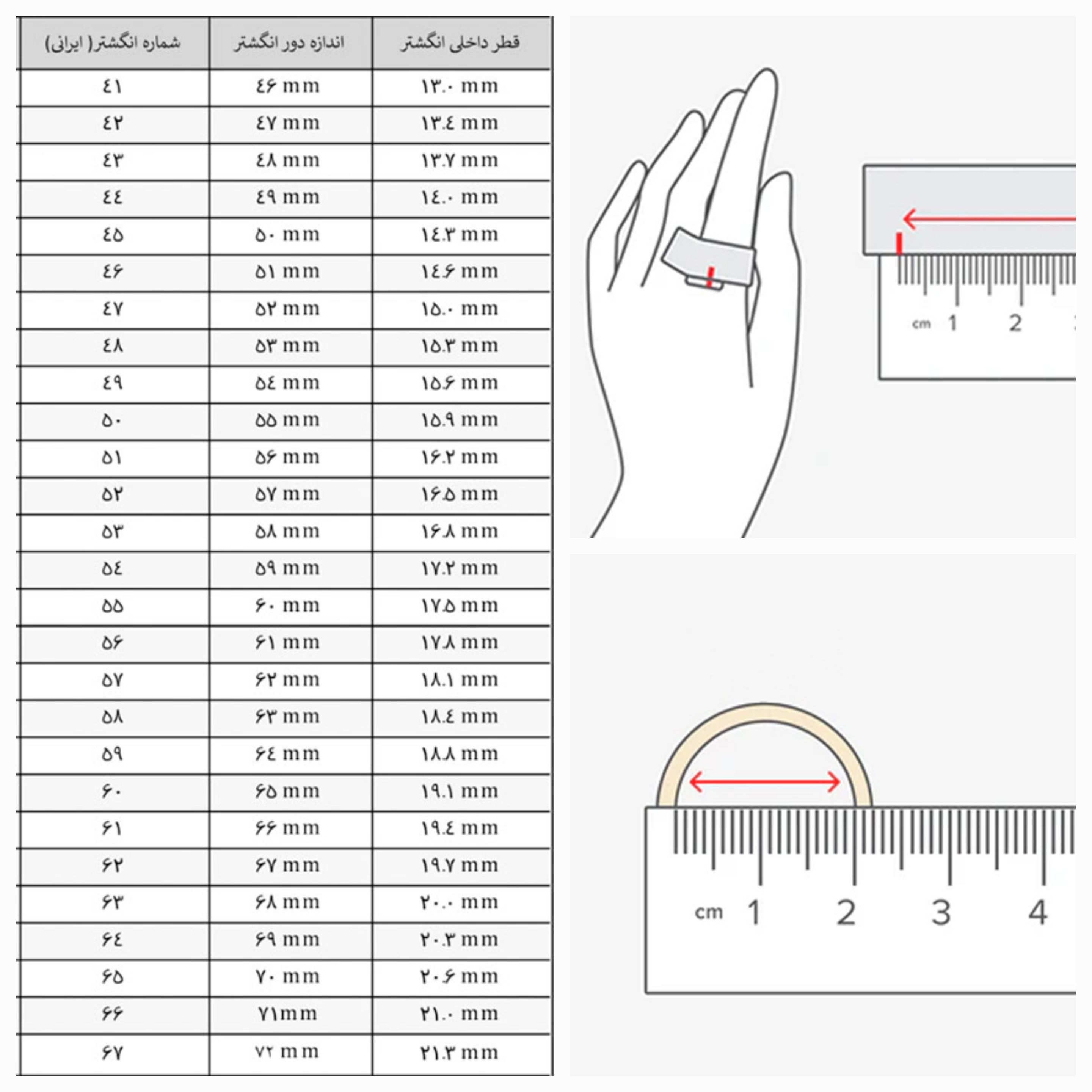 - لطفا بخش "سایز بندی" در منوی وب سایت را مشاهده فرمایید و از سایز دقیق انگشت خود اطمینان حاصل فرمایید.