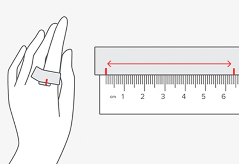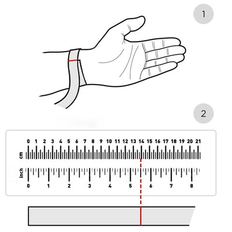 برای تعیین سایز دستبند ، نوار کاغذی را به دور قسمت انتهایی مچ دست خود بپیچید. وقتی دو انتهای آن به هم رسید، آن نقطه را علامت بزنید؛ سپس نوار را روی خطکش بگذارید و طول آن را به سانتیمتر بدست آورید و با جدول تطابق دهید.