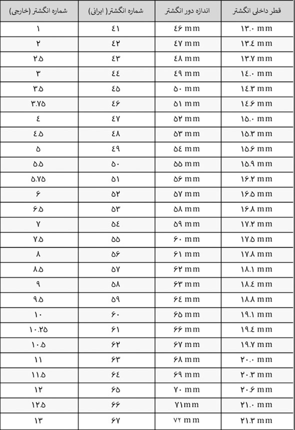 انگشتری که برایتان مناسب است را در نظر بگیرید و بزرگترین قطر داخلی آن را با خط کش اندازه بگیرید و سپس با کمک جدول زیر سایز انگشتر خود را مشخص کنید. (انگشتر انتخابی شما نباید خیلی تنگ یا خیلی گشاد باشد.)