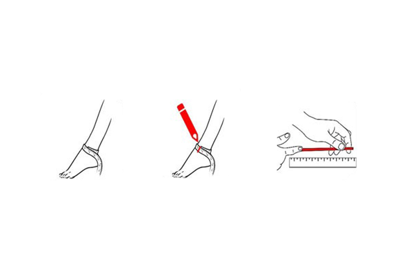 میتوانید از یک نوار کاغذی استفاده کنید. برای اندازهگیری درست سایز پابند ، نوار کاغذی را دور مچ پا و از زیر قوزک پا بپیچید. در اندازهگیری دقت کنید که نوارکاغذی نه خیلی به مچ پای شما بچسبد و تنگ باشد و نه خیلی گشاد باشد؛ سپس محل تلاقی دو سر نوار کاغذی را علامت بزینید؛ نوار را روی یک خطکش بگذارید (به صورت صاف و کشیده)، تا اندازه دور مچ شما بدست آید و سپس با جدول تطبیق دهید.